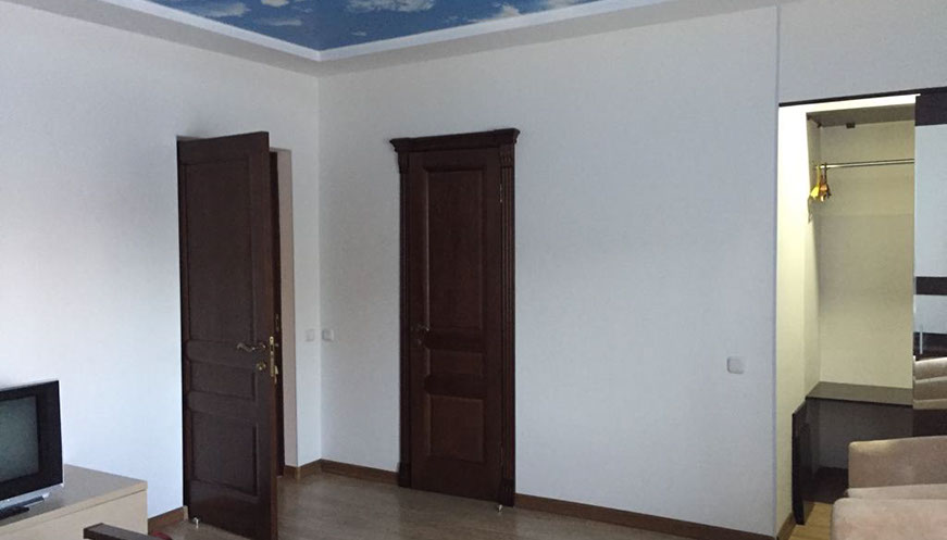 Двухспальная кровать, прикроватные тумбы, холодильник, плательный шкаф, телевизор, душ. кабина, сан.узел, раковина
